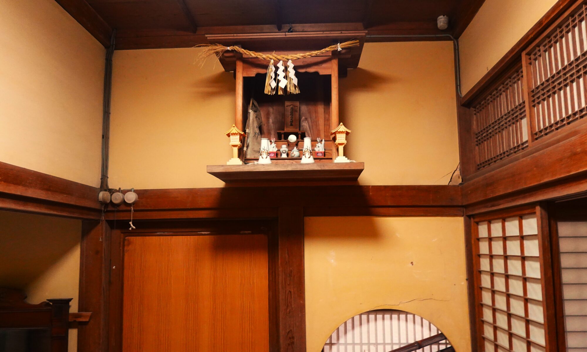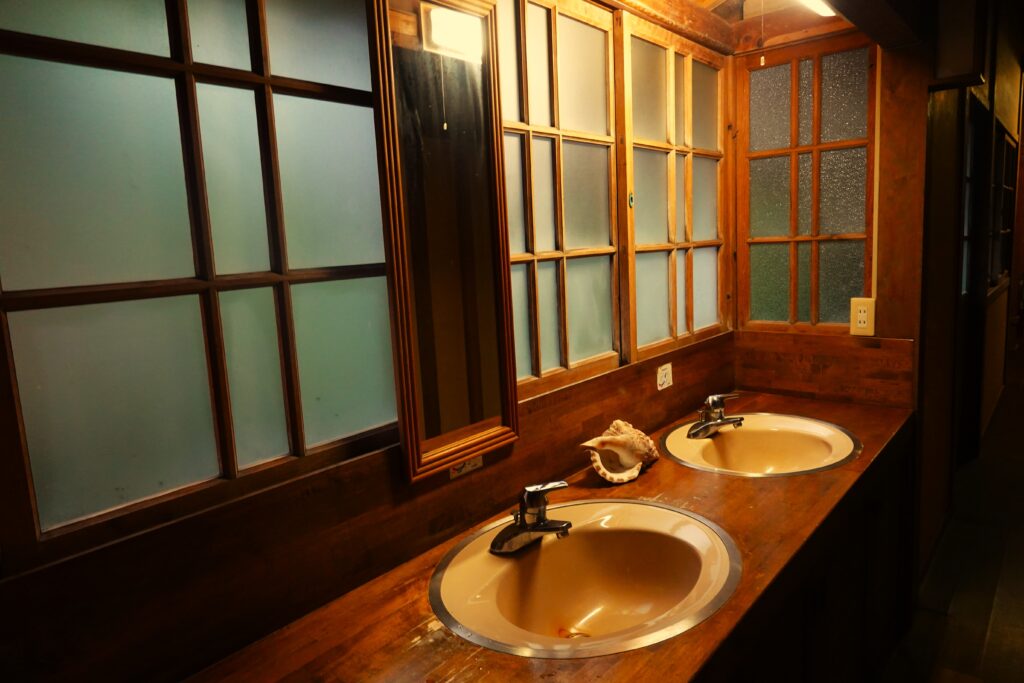 昭和初期のスリガラスがレイアウトされている洗面所は、昔ながらの共有スペースです。
