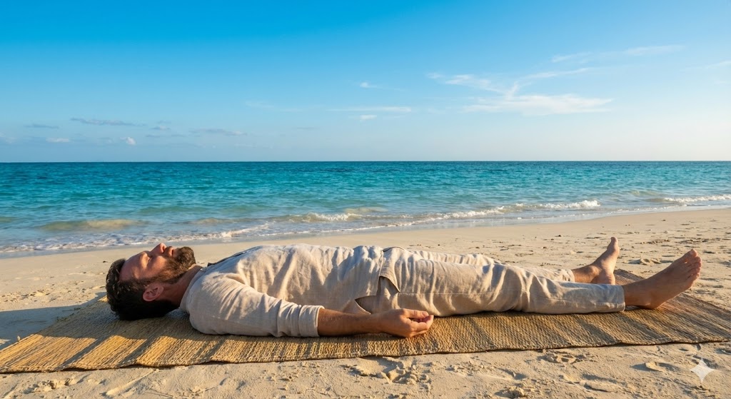 3. 寝転び瞑想(シャバアーサナ) 心と体が落ち着いたところで、砂浜に仰向けに寝転びます。全身の力を抜き、地球に身体を預けるような感覚で、究極のリラクゼーションを味わいます。