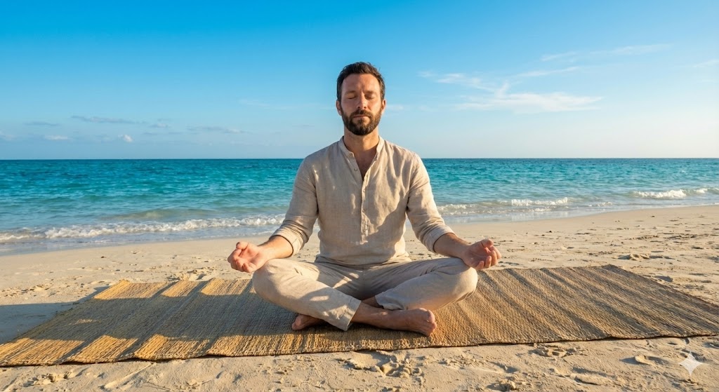 2. 呼吸法のレクチャーと坐禅 砂浜にゴザを敷き、インストラクターのガイドに合わせて呼吸を整えます。まずは座った姿勢で背筋を伸ばし、波の音と呼吸のリズムを同調させていきます。