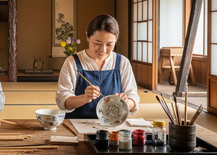 天草で老舗の高浜寿芳窯の白磁の皿にオリジナルの絵付けができます。